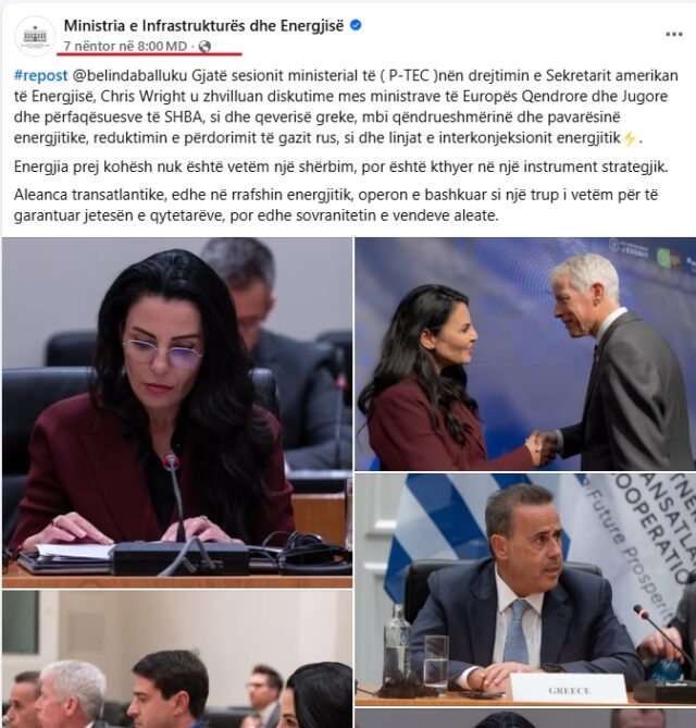 “During the ministerial session of P-TEC, chaired by U.S. Secretary of Energy Chris Wright, discussions took place among the ministers of Central and Southern Europe and representatives of the U.S., as well as the Greek government, focusing on energy sustainability and independence, reducing the use of Russian gas, and energy interconnection lines,” Balluku wrote on social media, accompanying the post with the photo.