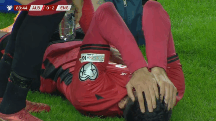 Në minutën e 90/+2, në tentativë për të shmangur mbrojtësit anglezë, Broja dëmton kaviljen dhe shtrihet përtokë. Pavarësisht ndërhyrjes së stafit mjeksorë, dëmtimi dukej i rëndë dhe sulmuesi i kombëtares shpërtheu në lot.