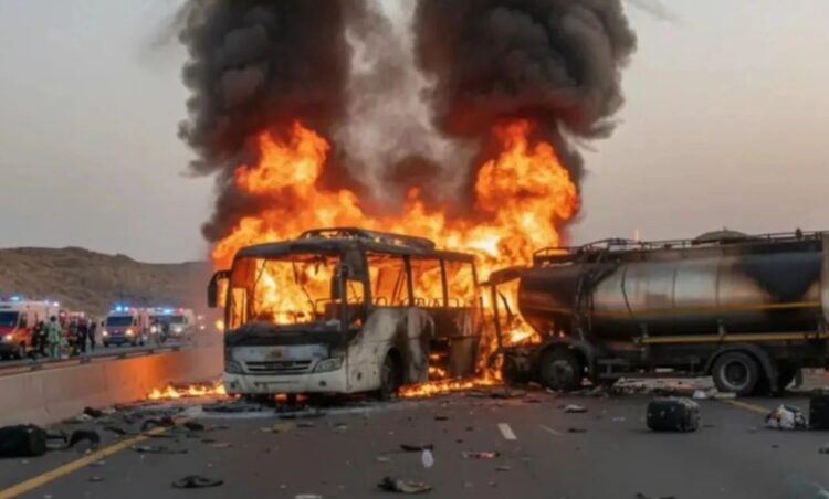 A bus carrying Indian Umrah pilgrims from Hyderabad collided with a diesel tanker on the Mecca-Medina highway around 1:30 a.m., igniting a fire that killed 42 people, including 20 women and 11 children. pic.twitter.com/ZMi5znPf5s