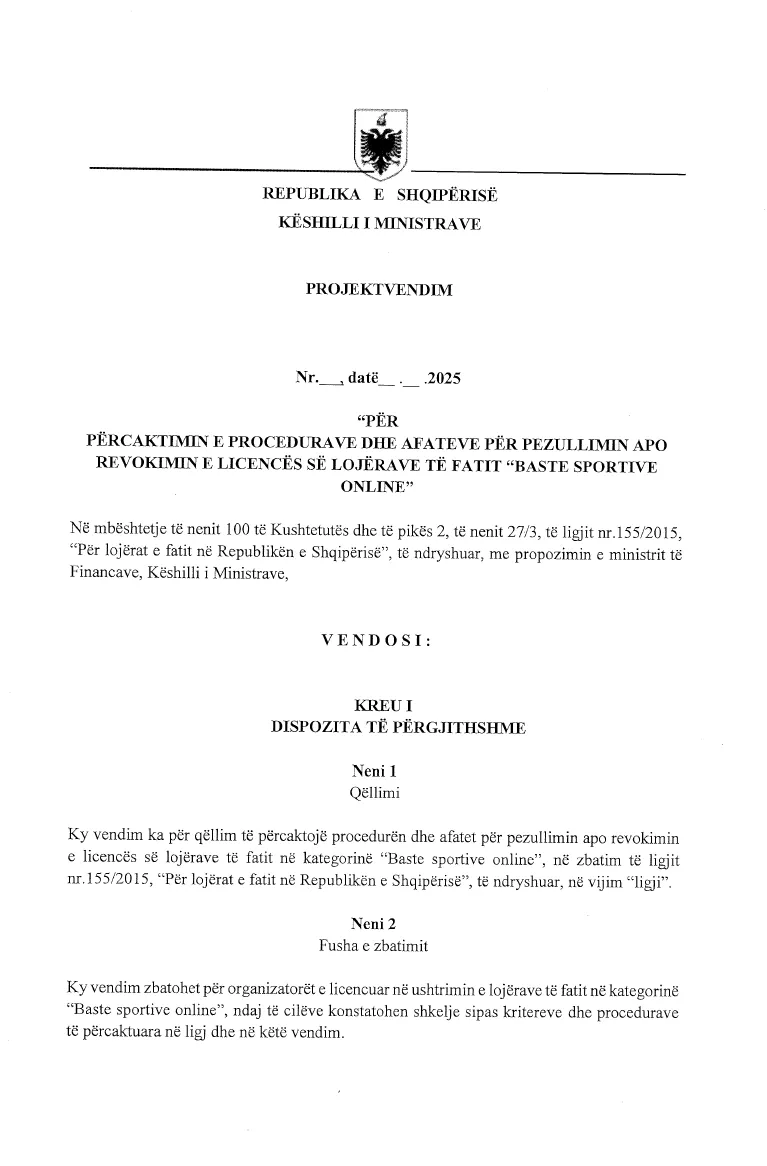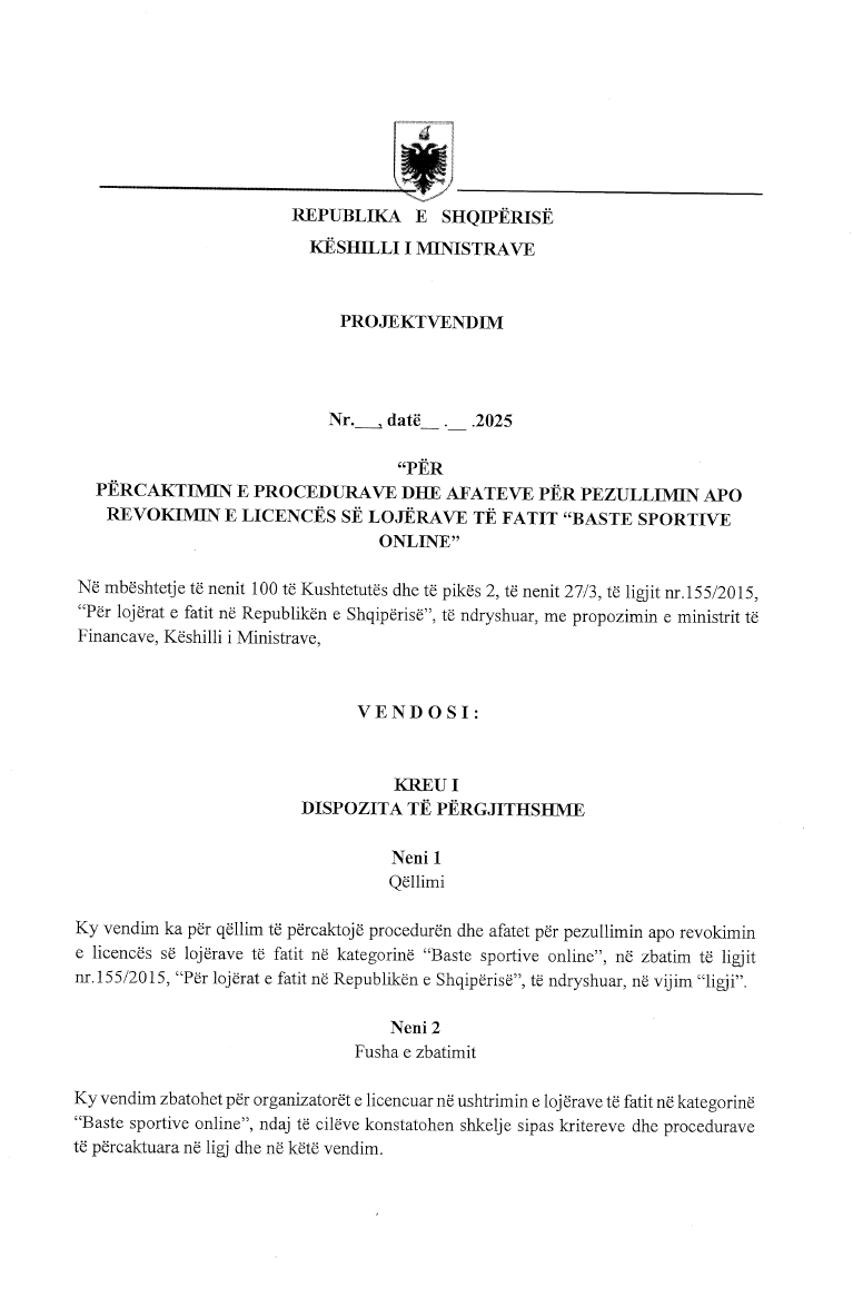 1. Projektvendimi për pezullimin/revokimin e licencave të basteve online