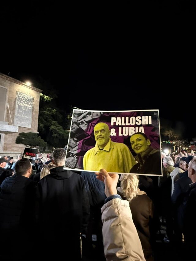 “Palloshi dhe Lubia”, lexon në një tjetër pankartë që mbajnë në duar protestuesit, duke iu referuar kryeministrit Edi Rama dhe ministres Balluku.